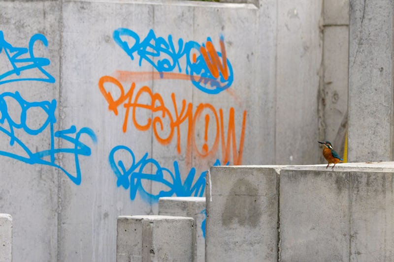 En kungsfiskare framför matchande graffiti. Djurlivet finns ofta närmare än vi tror, och det finns skönhet och livskraft även i våra mest urbana miljöer.