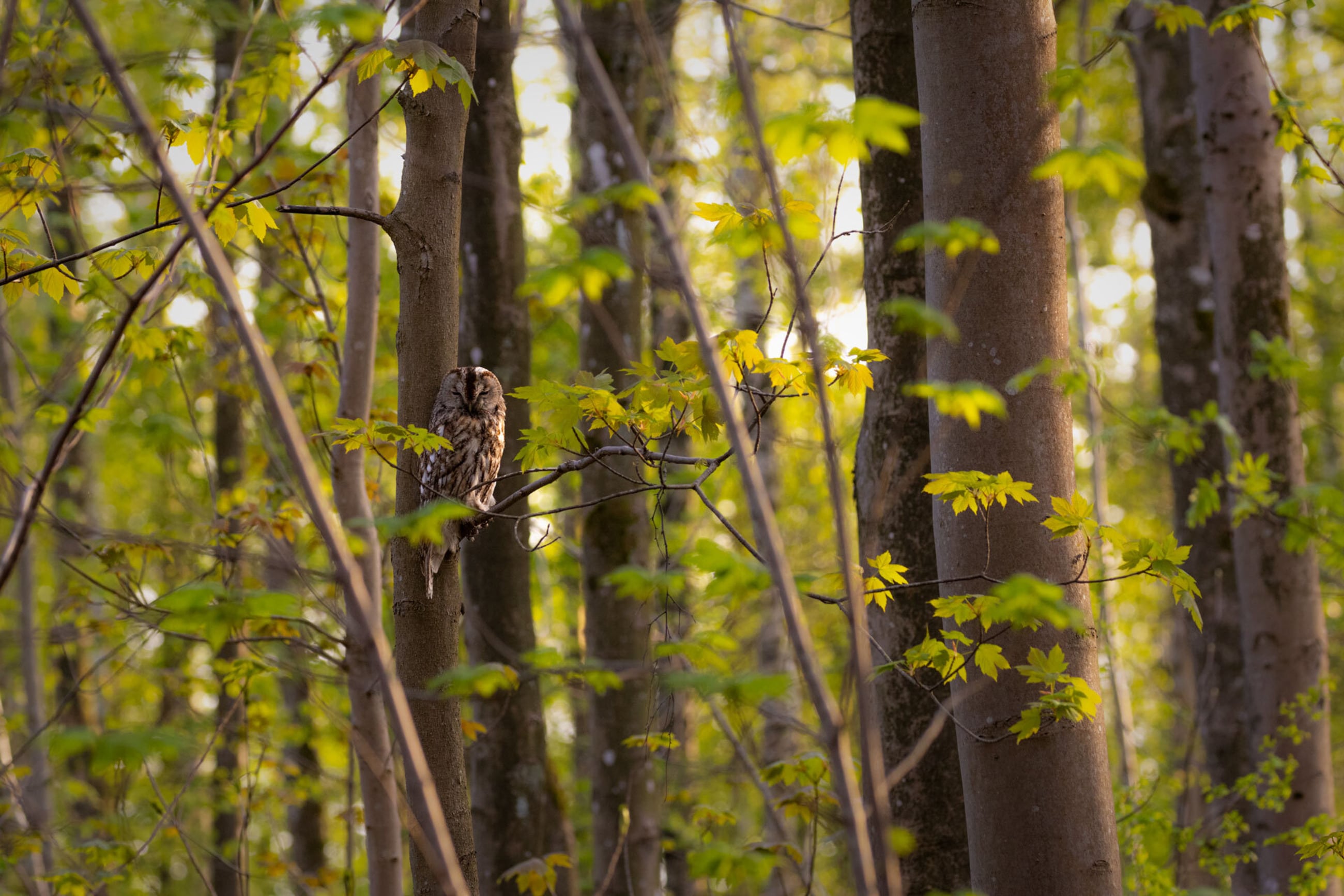 En välkamouflerade kattuggla i sin rätta skogsmiljö. Uppe i träden sitter ungarna, därför har mamman bra koll på allt som rör sig i skogen.