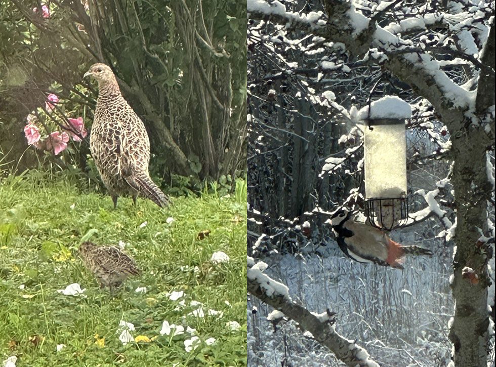 ”Här har jag lyckats fånga en av våra försiktiga fasanhonor som lyckats få en liten telning att överleva. Den såg vi växa sig stor. Fasantupparna är karskare och kommer oftare än honorna. Så vackra fåglar tycker jag. Skickar också med Hacke, vår hackspett, som underhåller oss varje dag. Han skriker sitt tjuiit, tjuiit för att uppmärksamma oss på att fylla på i fågelmataren.” Det skriver Kristina Gärdebo Johansson i Uppsala.