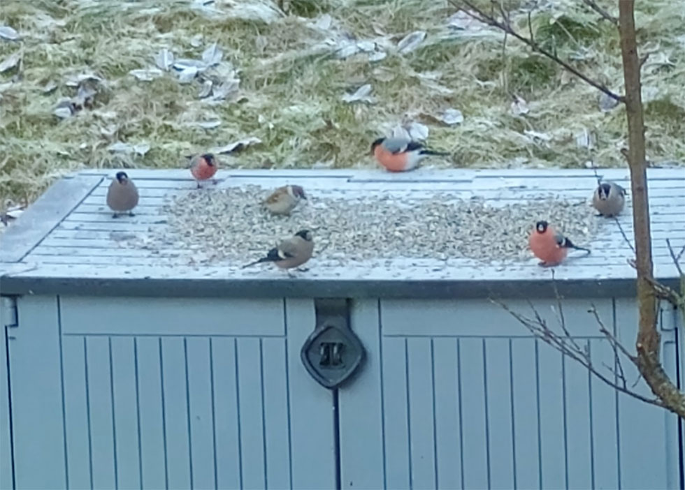 Jane Holmgren i Sundsvall skriver: ”Jag blir så glad när domherrarna kommer fram. Först kommer talgoxe, blåmes, entitan, pilfink (ny gäst sedan förra året) . Hört domherrens sorgsna vissling men inte sett dem förrän nu när köldknäppen kom. Jag är tacksam att bo i hus och kunna mata dem (men fy vad de höjt priset på fågelmat). Min man kallar dem mina små vänner och har också börjat tycka om att stå och studera dem.”