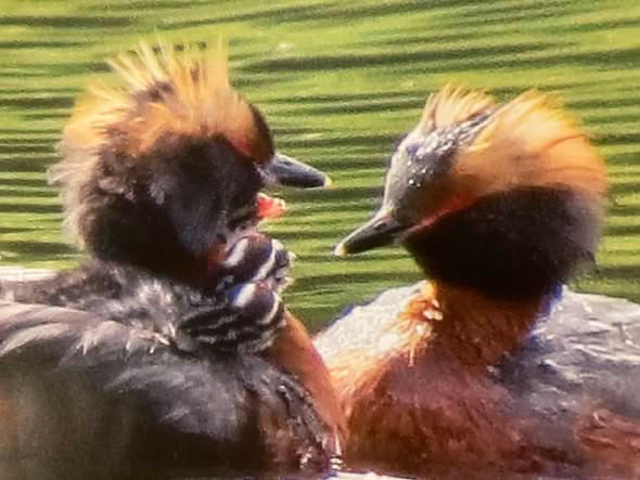 Gunhild Eriksson Nyberg, i Umeå, skriver: ”En av mina favoritfåglar är den vackra färggranna svarthakedoppingen. Den följer jag varje sommar i Slåttertjärn där den häckar och återkommer till varje vår, eftersom där inte finns några rovfiskar och den bygger sitt bo på vattnet. Jag brukar följa den ofta och har haft turen att se den bygga sitt flytande bo i vassen ofta i närheten av badstranden. Det är en upplevelse att se när honan tar ut sina ungar på öppet vatten första gången, dom ligger gömda under vingarna och på honans rygg ofta ses bara huvudet sticka fram. Hanen hämtar föda från vattnet och simmar fram och matar ungarna. När det är dags för simträning skakar honan av sig ungarna och simmar iväg en bit, ungarna följer då efter och när honan tycker det är tillräckligt tränat öppnar hon upp längst bak och ungarna klättrar upp på hennes rygg igen, för att åka tillbaka till boet i den skyddande vassen.”