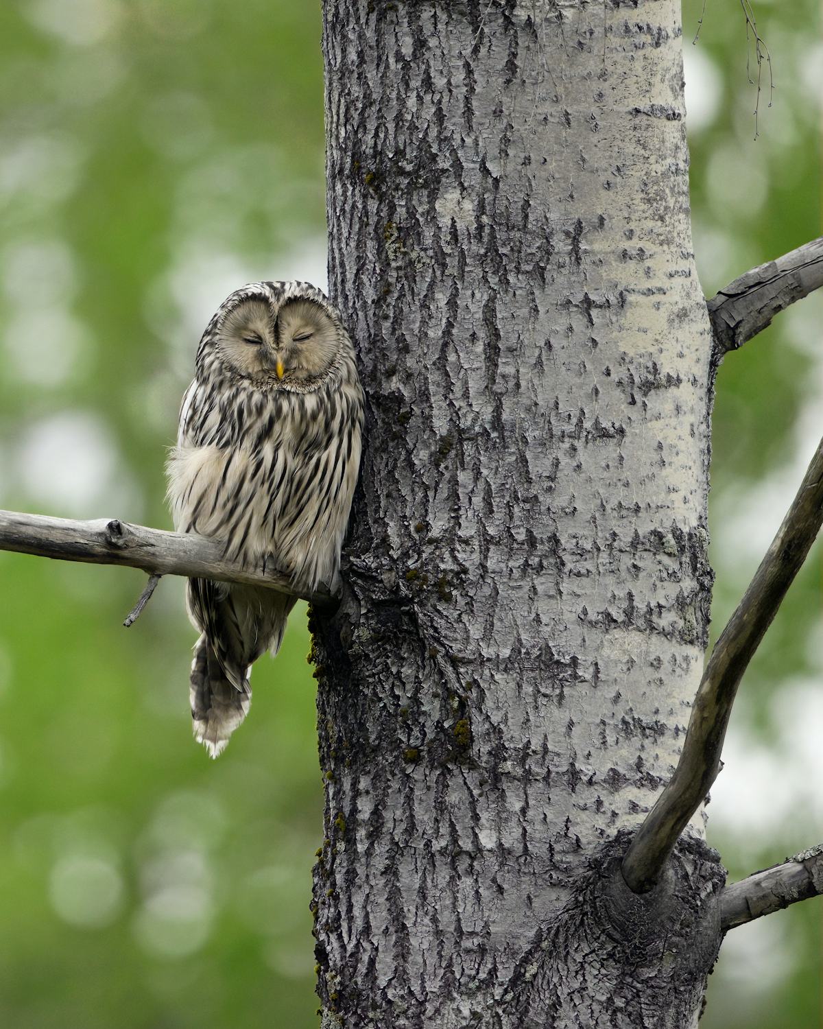 Jag tog den här bilden på en av mina slagugglehonor under en holkinspektion tidigt på sommaren, strax efter att ungarna lämnat boet. Hon vilade då i ett träd och i ett annat träd strax intill kunde jag se en av hennes ungar. Det är en fin känsla att kunna hjälpa dem, men också ett stort ansvar, då slagugglan stannar hela livet i sitt revir.