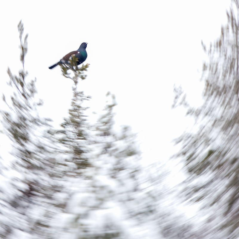 En dag när jag besökte min fågelmatning fick jag syn på en tjädertupp som satt och betade tallbarr i en talltopp strax intill. Det var kallt, men jag fick för mig att experimentera med kameran i det gråmulna vintervädret. Jag smög mig försiktigt närmare tjädern, använde en lång slutartid och vred lite på mitt teleobjektiv när jag tog bilden. Den bilden blev startskottet för mitt fotoår.
