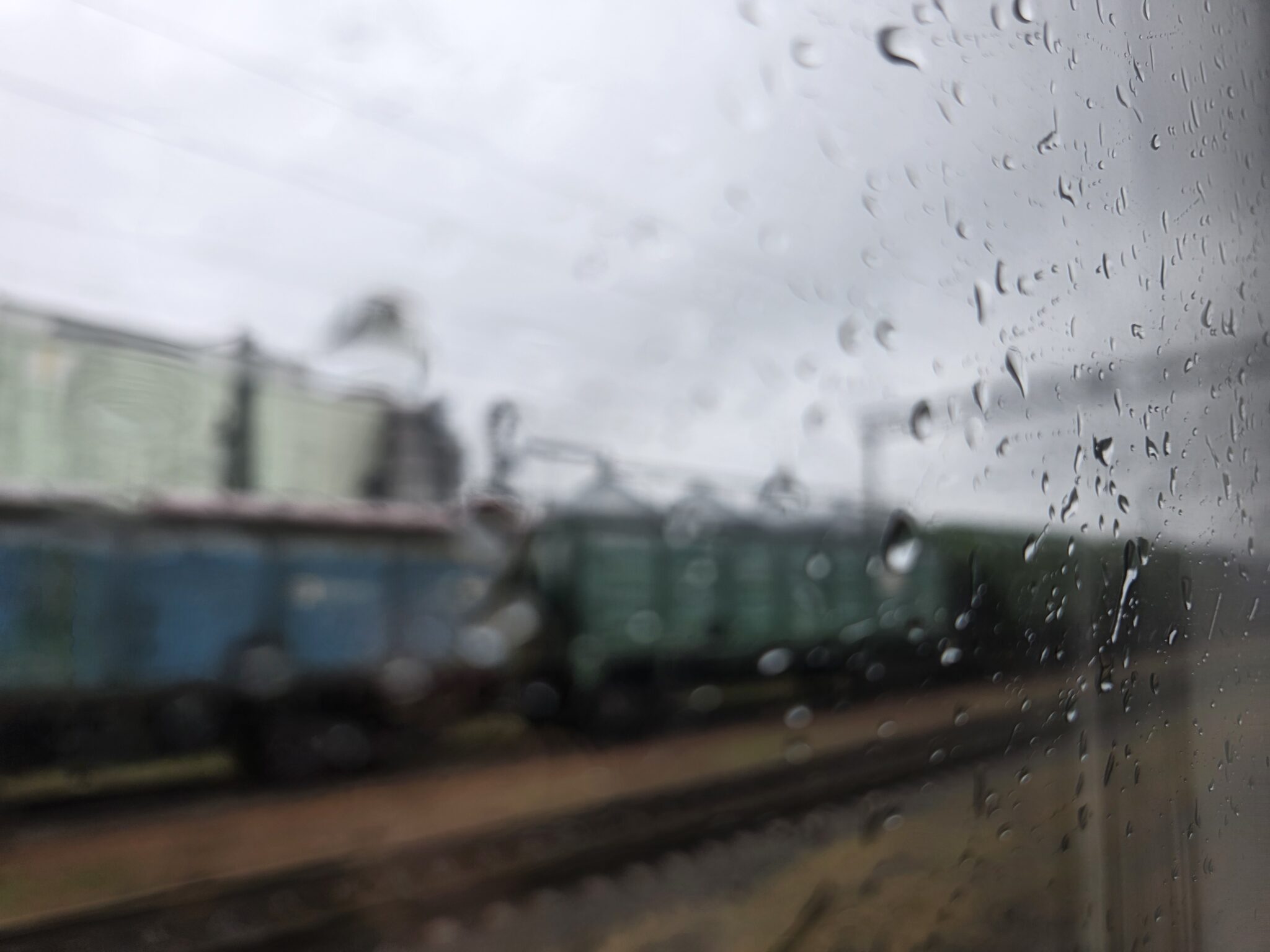 Här passerar vi ett ställe som bombades precis häromdagen. Järnvägen är igång igen och godståg står och väntar på sin tur i regnet.