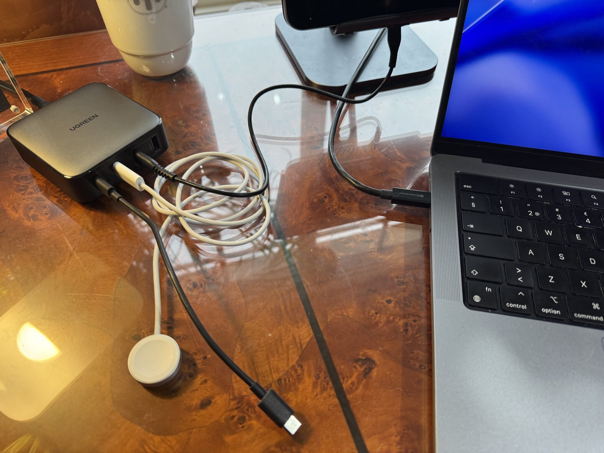 Det som totalt behövs – en nätadapter, USB-C till datorn, till paddan, till mobiltelefonen och en Apple Watchladdare. Därtill finns det en gammal sladd USB-A att ta till för t ex äldre powerbanks som behöver det eller äldre externa minneenheter, en USB-A till systemkrameran och en adapter för USB-C till USB-A. Och en HDMI-kabel vid behov, t ex för att koppla datorn till ett hotellrums teve och använda som andraskärm för arbete. Det är allt. Tillägg: Har även en USB-A till USB-C i ryggsäcken, vilket kan behövas på flyg och liknande eller för gamla powerbanks. Får ofta låna ut den.