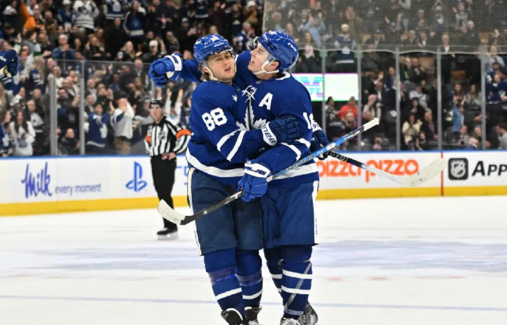Mitch Marner gjorde 102 poäng i grundserien i NHL förra säsongen. Matias Maccelli, Dakota Joshua och Nicolas Roy är nya forwarder i laget.