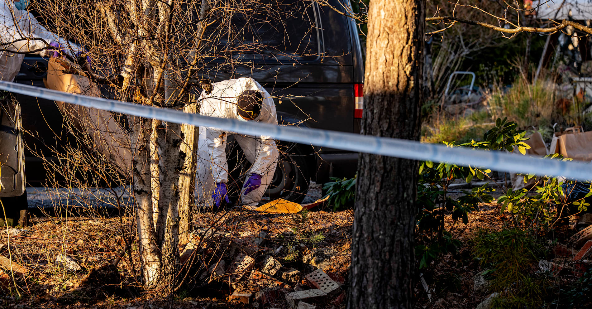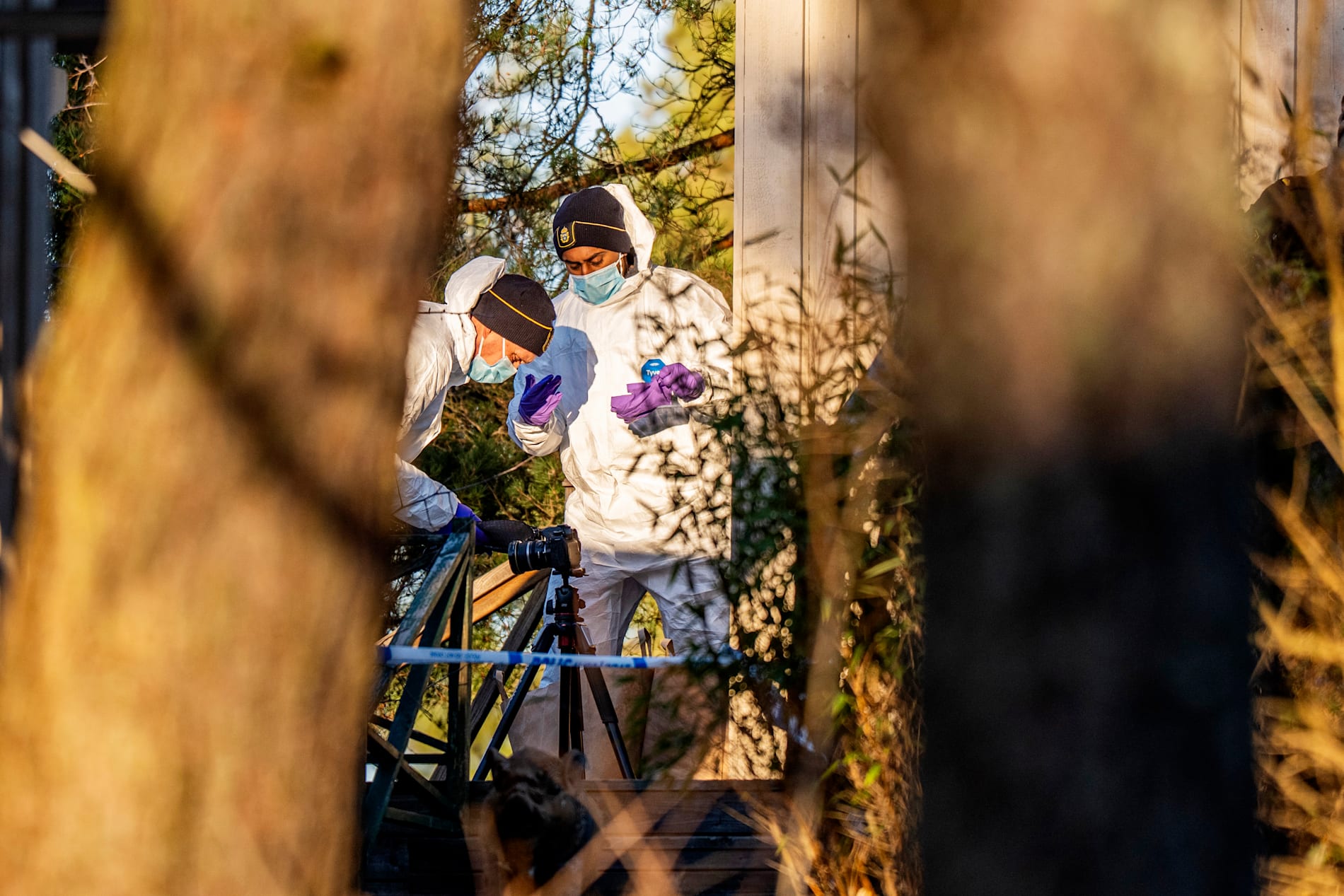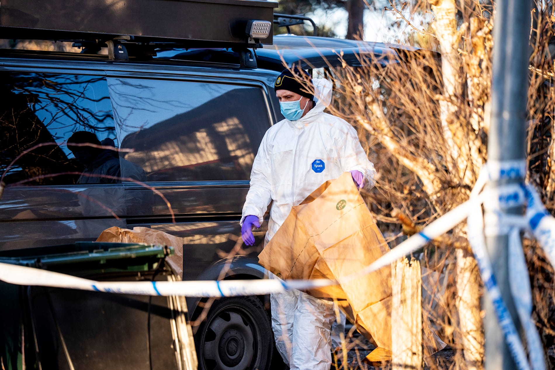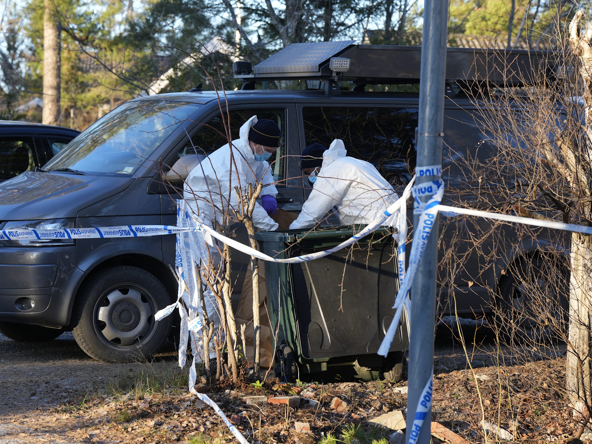 Polisens tekniker, i vita overaller och munskydd, letar bland annat i den misstänktes sopor, vilket Aftonbladets fotograf kunde fånga på bild alldeles nyss.