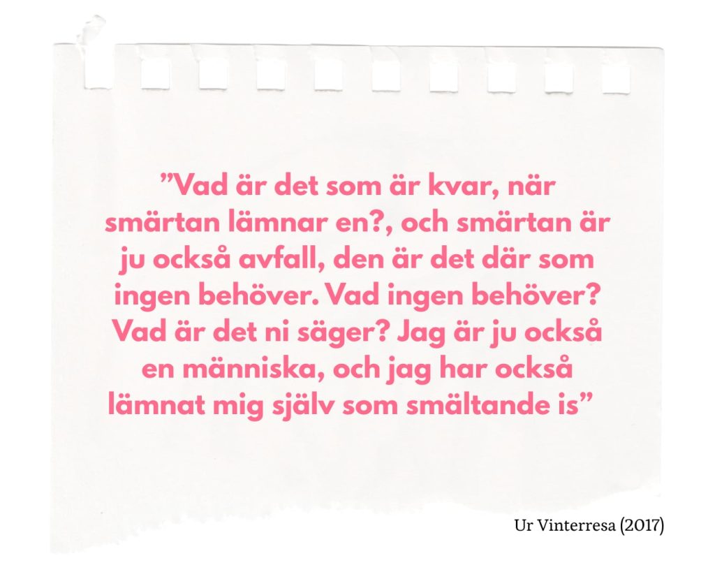 21 år har gått sedan dess. Jelinek verkar numera bortglömd i det skandinaviska teaterlandskapet, liksom dramatiken på den litterära scenen ofta behandlas som litteraturens oäkting; bortglömd och undangömd. Ändå finns det hos henne något alldeles sällsynt, en okuvlig och originell röst, tydlig genom sin motsägelsefullhet. Jelinek växte upp i efterkrigstidens Österrike, dotter till en psykiskt sjuk och frånvarande far samt en dominerande mor, som tidigt inställde henne till en karriär som musikalisk wunderkind. Efter ett psykiskt sammanbrott i tonåren ersattes musiken med ord, tangentbordet blev istället hennes instrument.