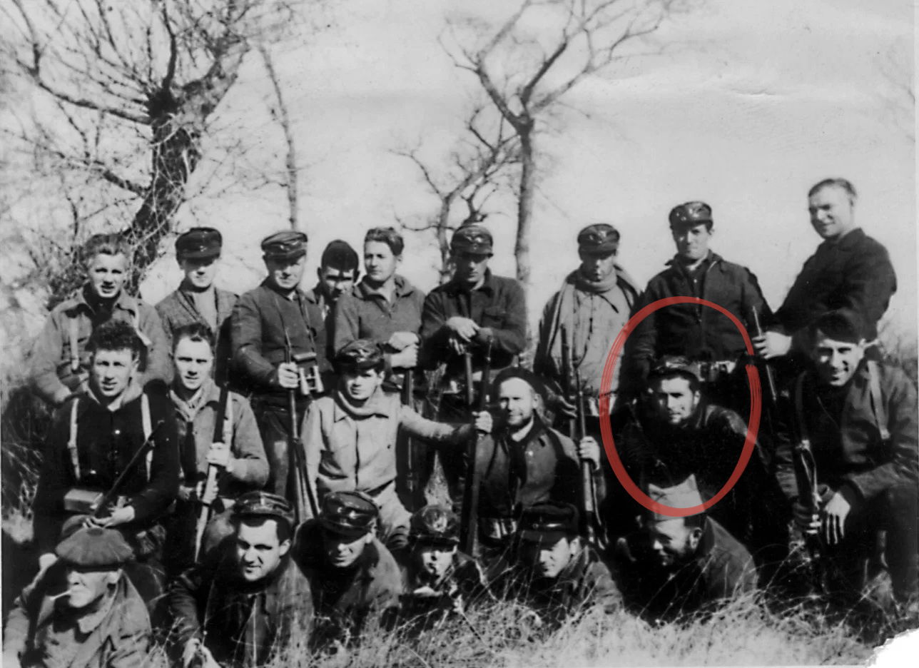 Svenskarnas grupp i Durrutikolonnens Internationella kompani, i Pina de Ebro, Spanien, 1937. Olle Jansson inringad. Bredvid honom (till vänster i bild) den kände anarkisten Nisse Lätt. Foto: Socialistiska partiets fotoarkiv, privat ägo