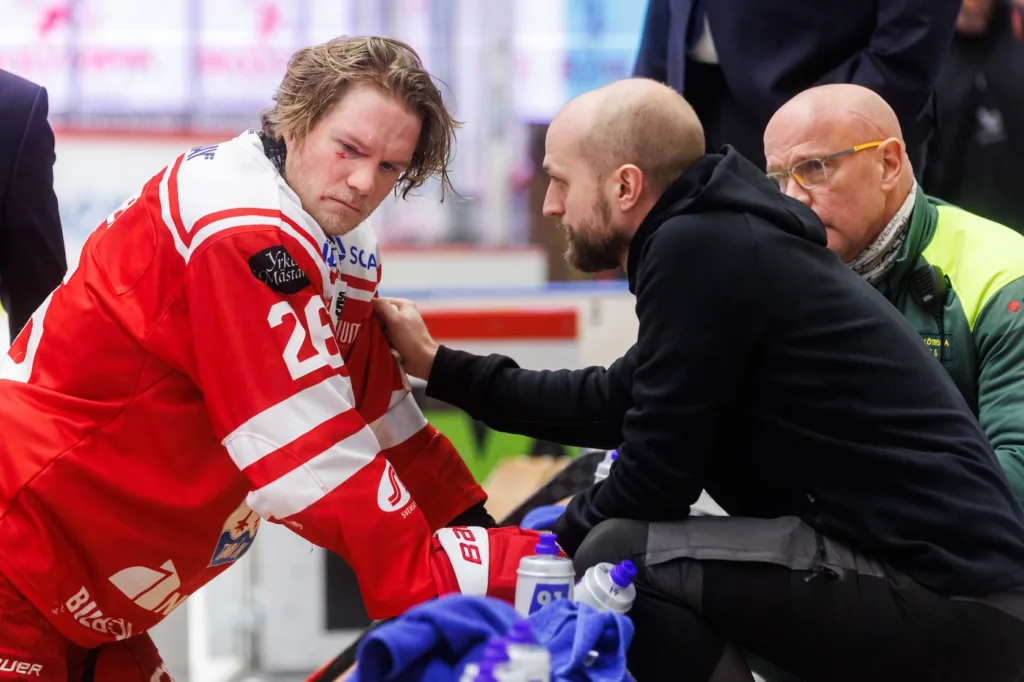Anton Heikkinen blev liggandes på isen i den första perioden och tog sig själv till båset. Men det var tydligt att han hade ont och fick vård av ambulanspersonal på avbytarbänken. Det blev inget mer spel i matchen.