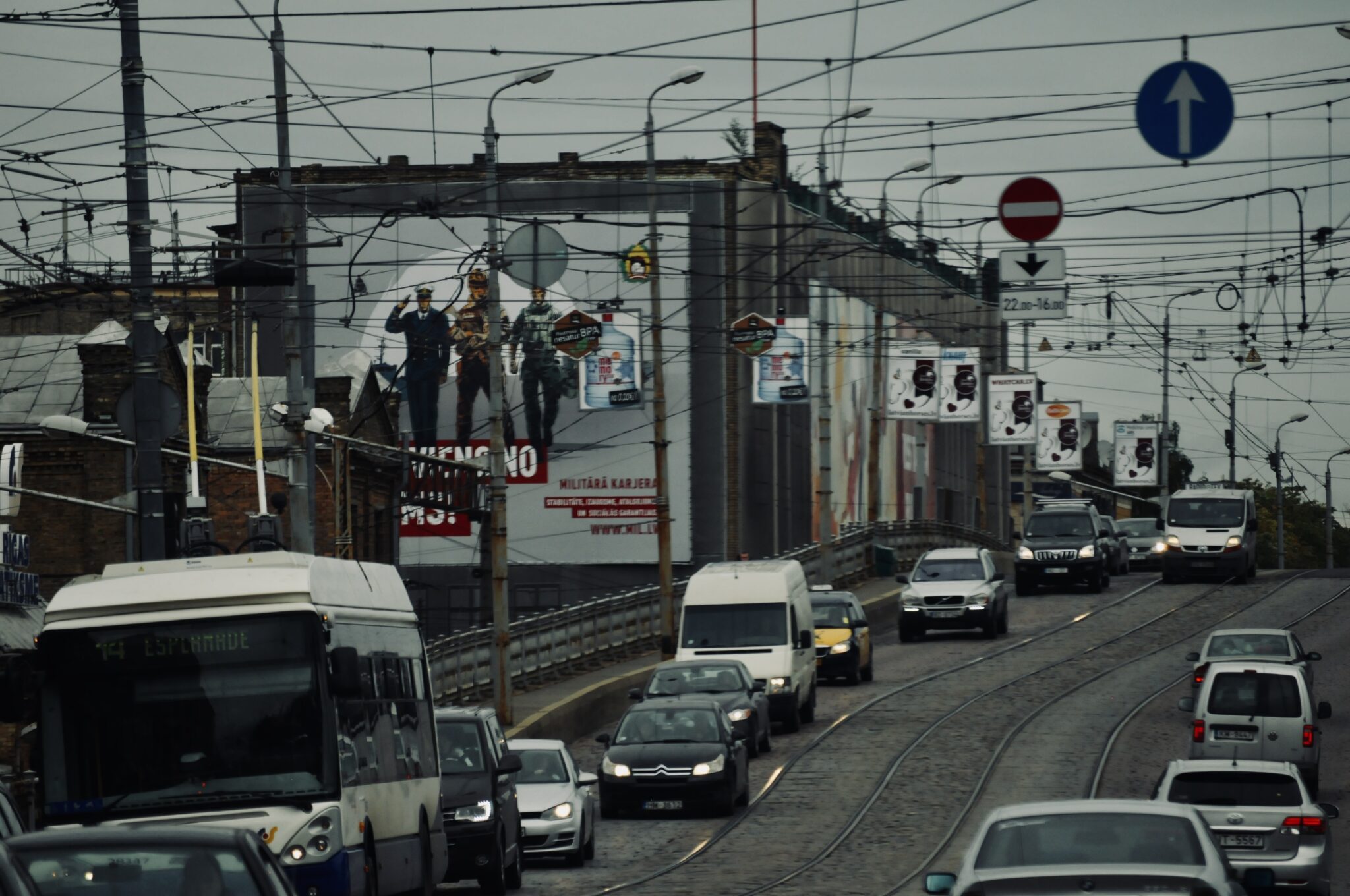 Biltrafik i Riga med en rekryteringsannons för lettiska försvaret. Arkivbild från 2017.
