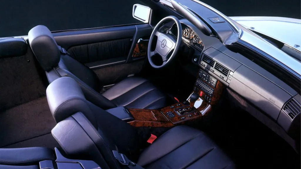Under huven sitter en femliters V8 med 326 hästkrafter. Det var siffror som placerade bilen i absoluta toppskiktet när den var ny men som också levererades med den typiska Mercedes-karaktären från tiden. R129 var också banbrytande ur säkerhetssynpunkt. Den automatiskt uppfällbara störtbågen blev snabbt ett kännetecken och var något helt nytt i klassen.