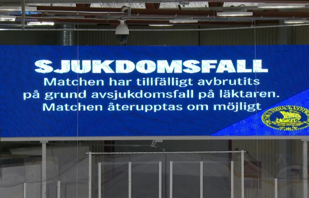 Efter ett avbrott som varade i nästan 20 minuter kunde pucken sedan släppas igen. Speakern på plats i arenan hördes säga att personen som insjuknat på läktaren hade förts till sjukhus. Enligt TV4:s kommentator Albin Skur ska personen i fråga ha fått hjälp av ambulanspersonal och varit vaken.
