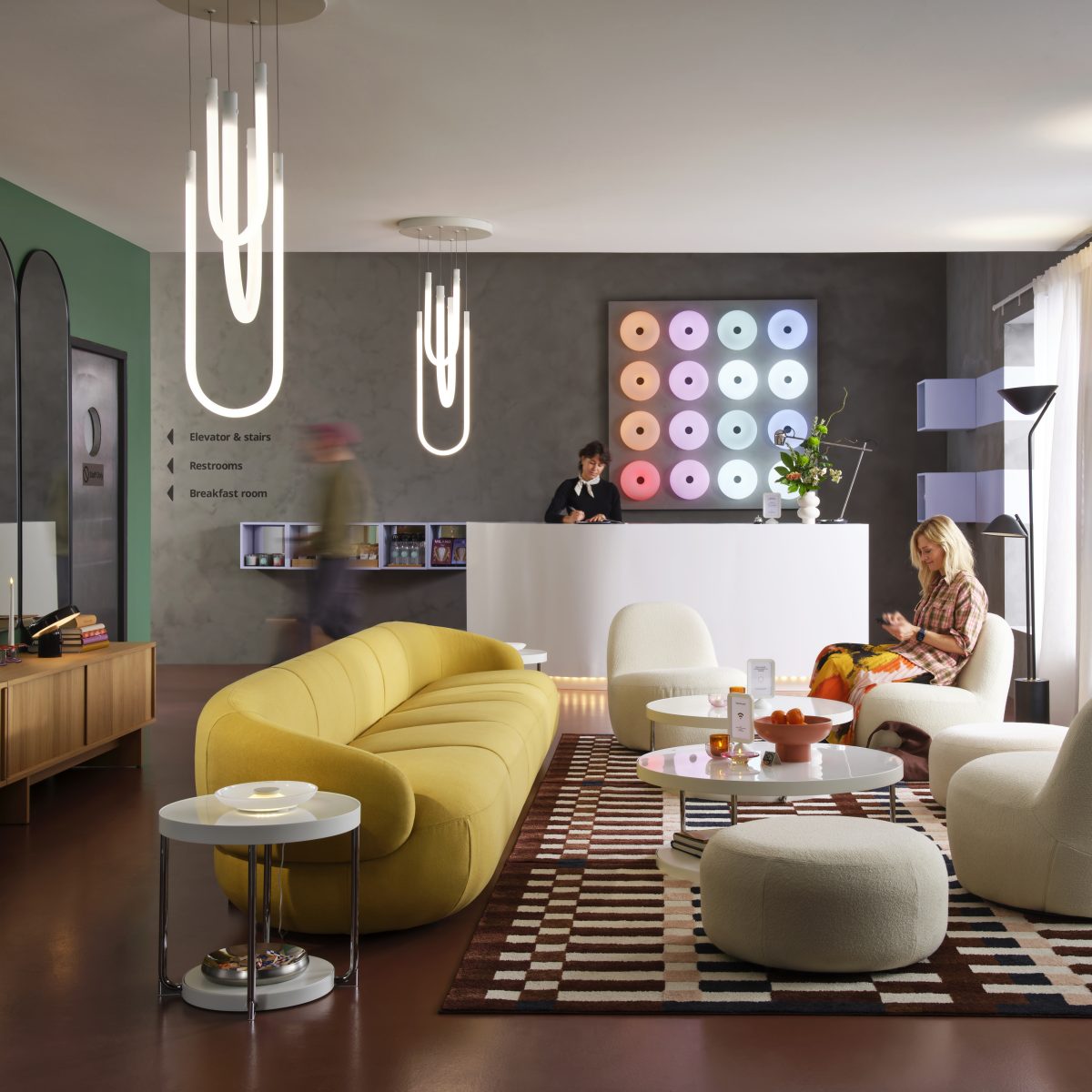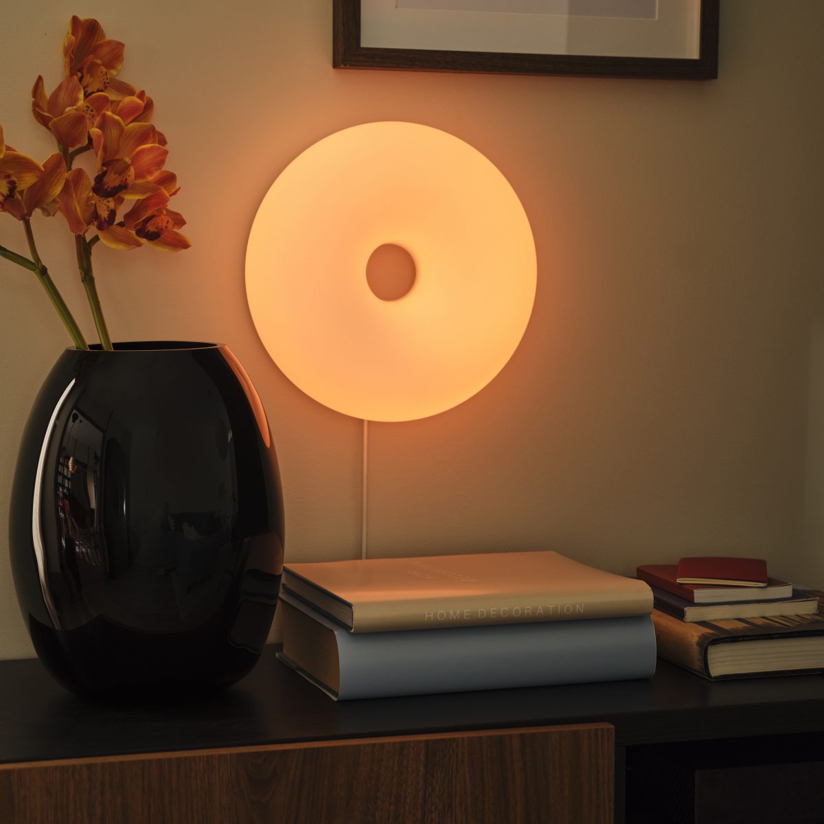 Den smarta donutlampan får en matt vit glasyta och kan skifta mellan ett brett spektrum av färger som förändrar känslan i rummet på ett subtilt och elegant sätt.