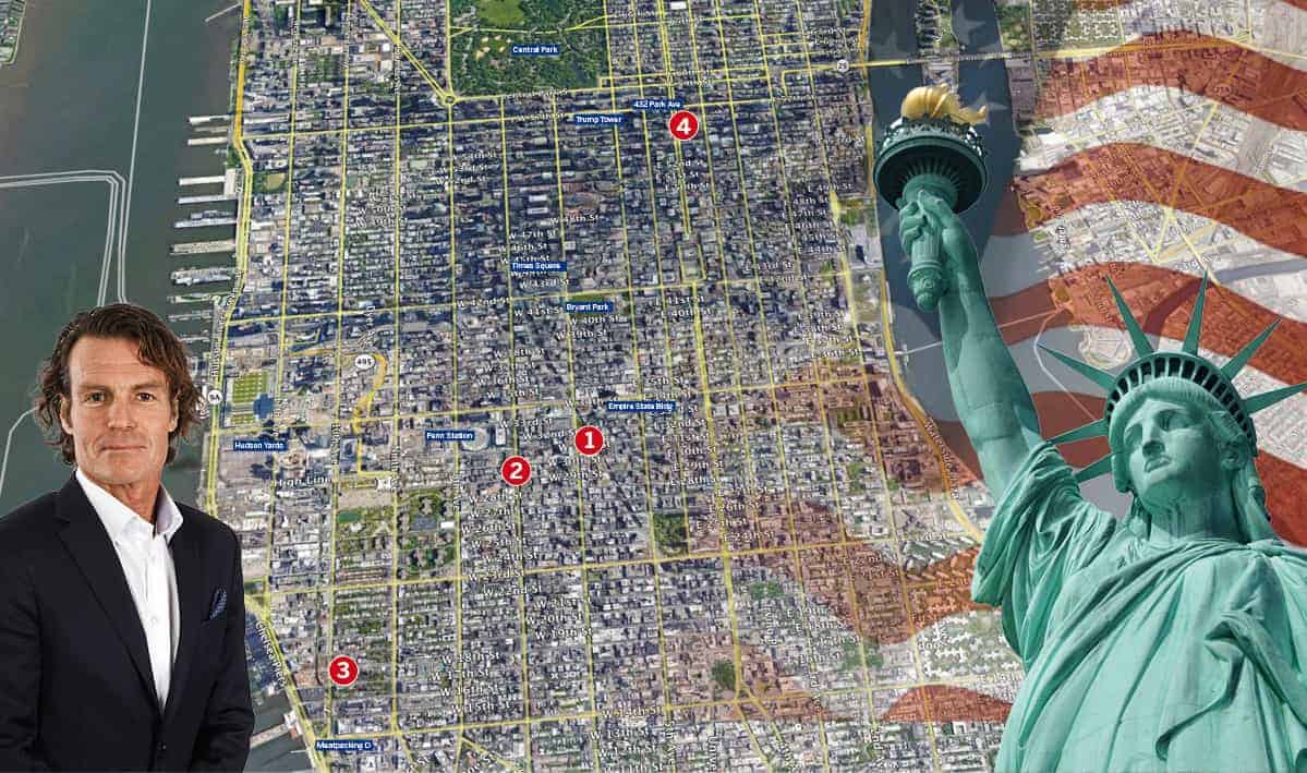 Corem storägare och vd Rutger Arhult. Kartan visar Corems fyra projektfastigheter på Manhattan. Nr 4 har sålts nu. Nr 3 såldes tidigt utan att ha utvecklats. Nr 1 och 2 har projektutvecklats och hyrts ut på höga nivåer, varav den ena har sålts. Montage: Fastighetsvärlden