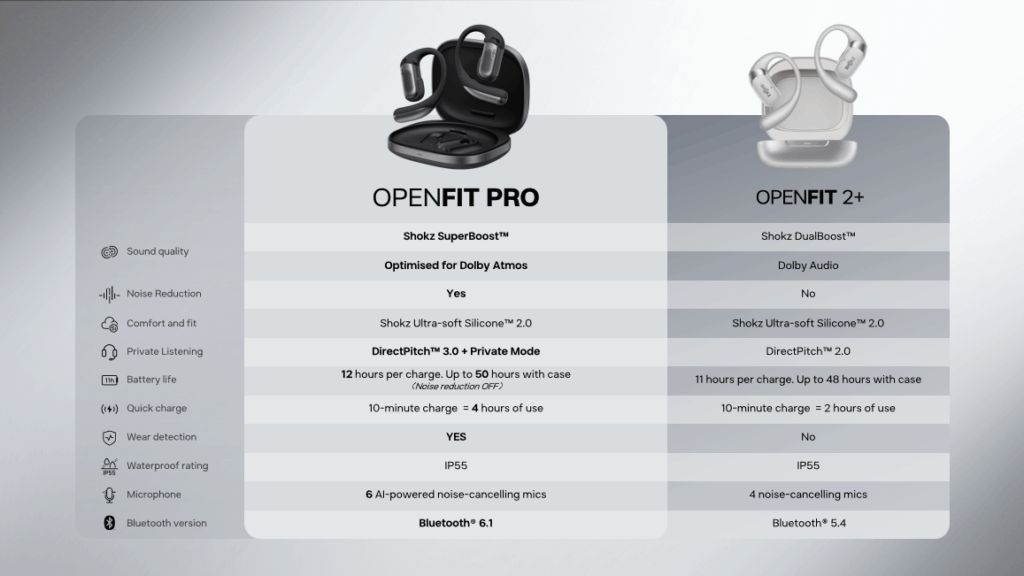 Ljudet förstärks av Shokz SuperBoost, vilket enligt företaget ska minska distorsion, ge jämnare bas och tydligare mellanregister.