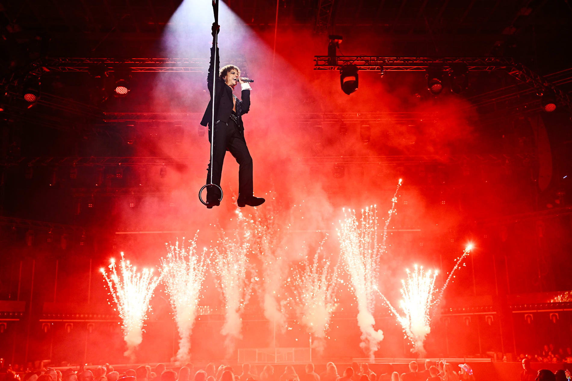 helskärmchevron-rightnästaUnder genrepet lyckades manövern i slutet av Greczulas nummer då han flyger upp mot taket. Tyvärr blev det tekniskt strul när det väl gällde i tv-sändningen. Arkivbild.