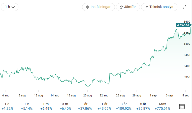 Även spotpriserna har ökat med 1,34 procent under dagen till 3 593,45 per uns i skrivande stund.