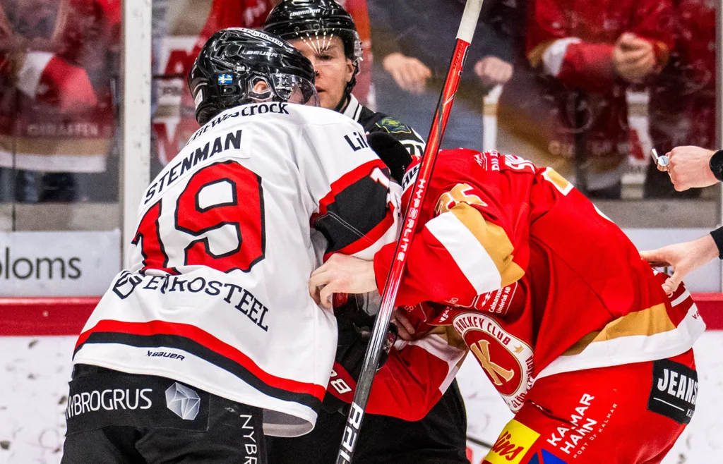 Nybros Elias Stenman och Kalmars Joel Svensson under ett möte i februari. Foto: Bildbyrån/Suvad Mrkonjic.