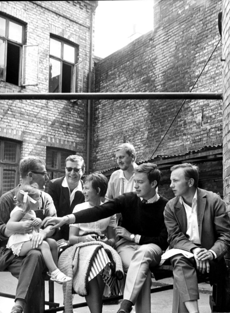 Bo Widerberg (till vänster) håller manusmöte i Malmös slumkvarter med skådespelarna i Kvarteret Korpen 1963. Foto: TT