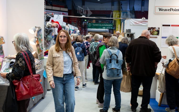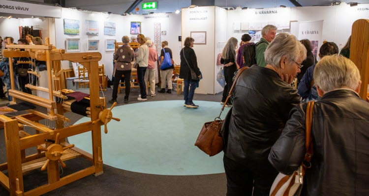 Många besökare samlade i området ”VÄVTORGET”, där vävda textilier och dukningar visas upp i olika montrar.