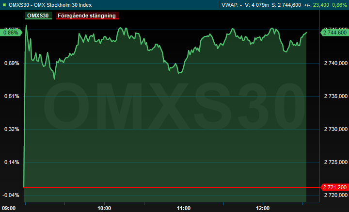 Omkring klockan 12.30 var det svenska storbolagsindexet OMXS30 upp 0,9 procent till nivån 2.745. Aktier för omkring 6,4 miljarder kronor var då omsatta på Stockholmsbörsen.