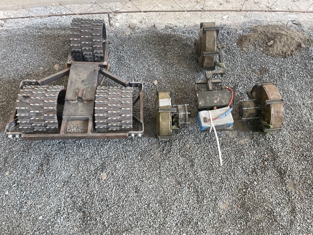 Användningsområdena skiftade. Här på gården monterade man just en markdönare med en kulspruta. Markdrönare kan också lägga ut minor och de kan användas till att transportera skadade. En stridssjukvårdare som släpar en sårad med sig blir ett lätt byte för fiendens drönare. Flaket till sjukvårdsdrönare jag såg hade ett slags rundad pulka ovanpå och spännen så den sårade inte ramlade av.