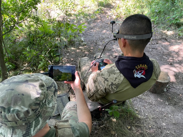 Luftdrönare används fortfarande också, ja ännu mer än förra året, särskilt FPV-drönare. Förkortningen uttyds First Person View, och syftar på att det bara är piloten som ser vad drönaren ser. Han gör det genom ett slags stora glasögon – goggles för att citera Nils Ferlin – han spänt fast runt huvudet. Drönaren styr han från en kontrollkonsol som liknar dem som används till datorspel. I fält har han kontrollkonsolen i knät.