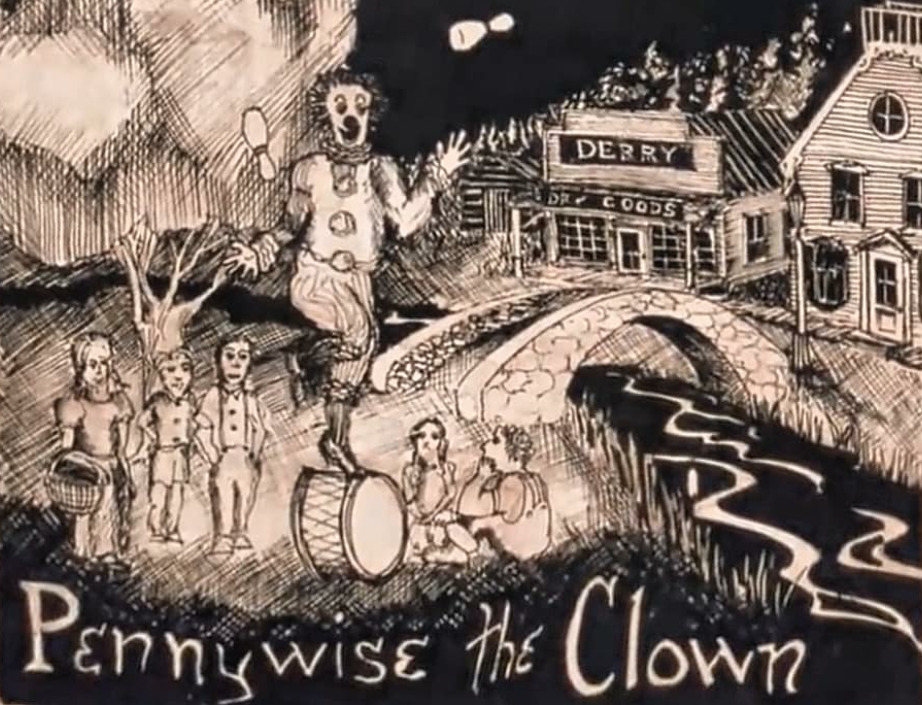 Den onda clownen Snåljåp sätter skräck i Derry i Stephen Kings roman Det (1986). Okänd illustratör.