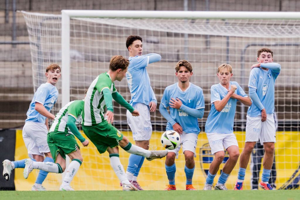 251030 Malmös spelare står i mur vid en frispark under finalen i P16 Allsvenskan mellan Malmö FF och Hammarby den 30 oktober 2025 i Malmö.