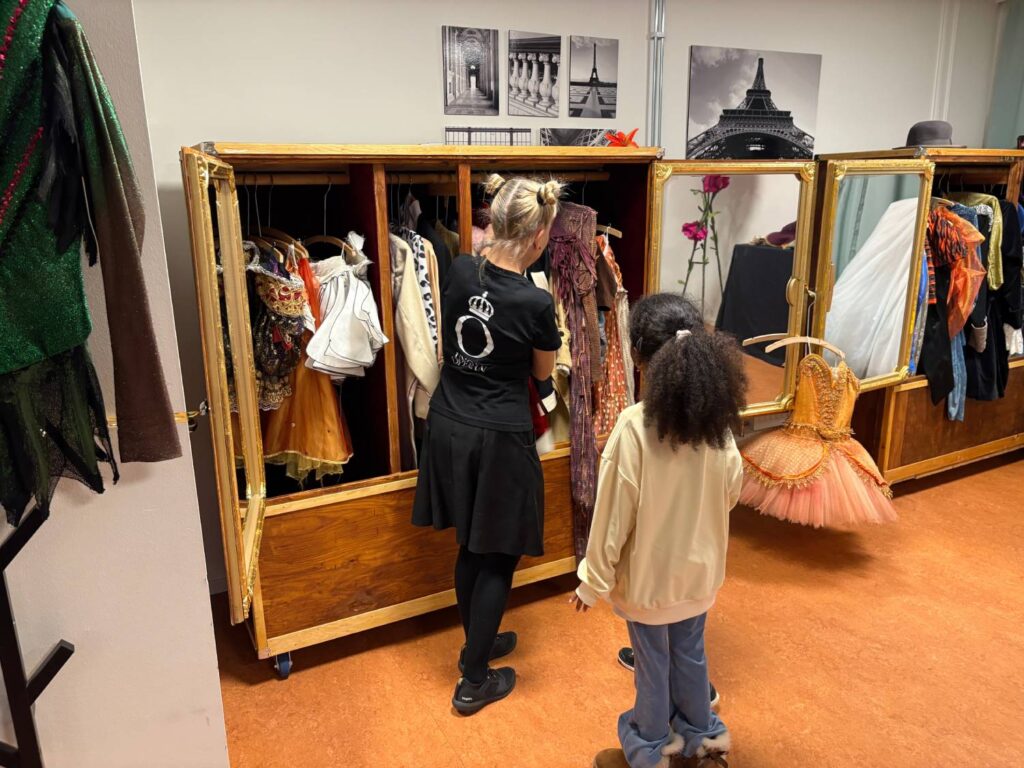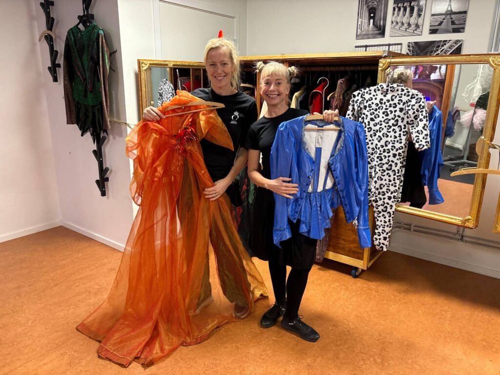 Sara Lewerth och Lena Nilsen hjälper barnen till rätta och berättar om dräkternas historia. På en etikett i plagget finns information om vilken föreställning plagget varit med i och vem som använt kostymen och även vilket årtal den användes. I några står flera namn och årtal.