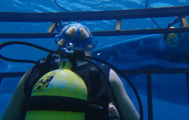 I ”47 Meters Down” kastas två systrar ned i en mardröm när deras hajbur sjunker till botten av havet samtidigt som syret tickar ned mot noll. Snabbt omringas systrarna av hajar och kampen om överlevnad börjar.