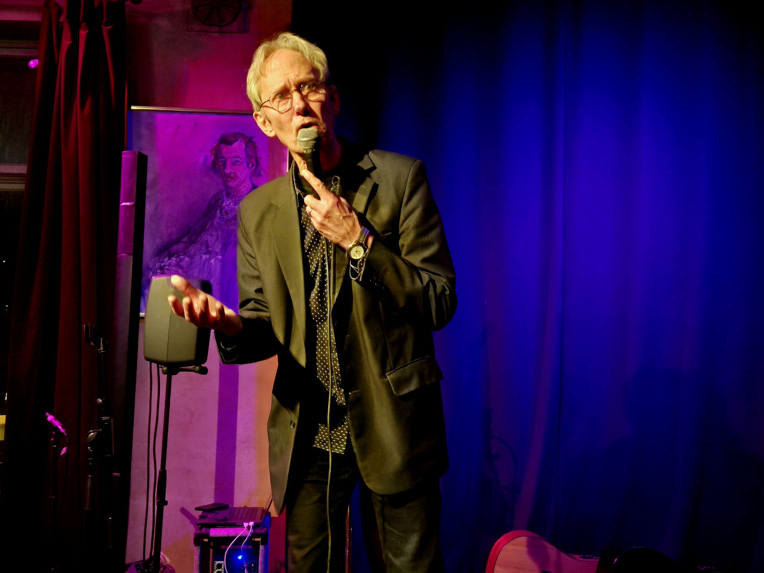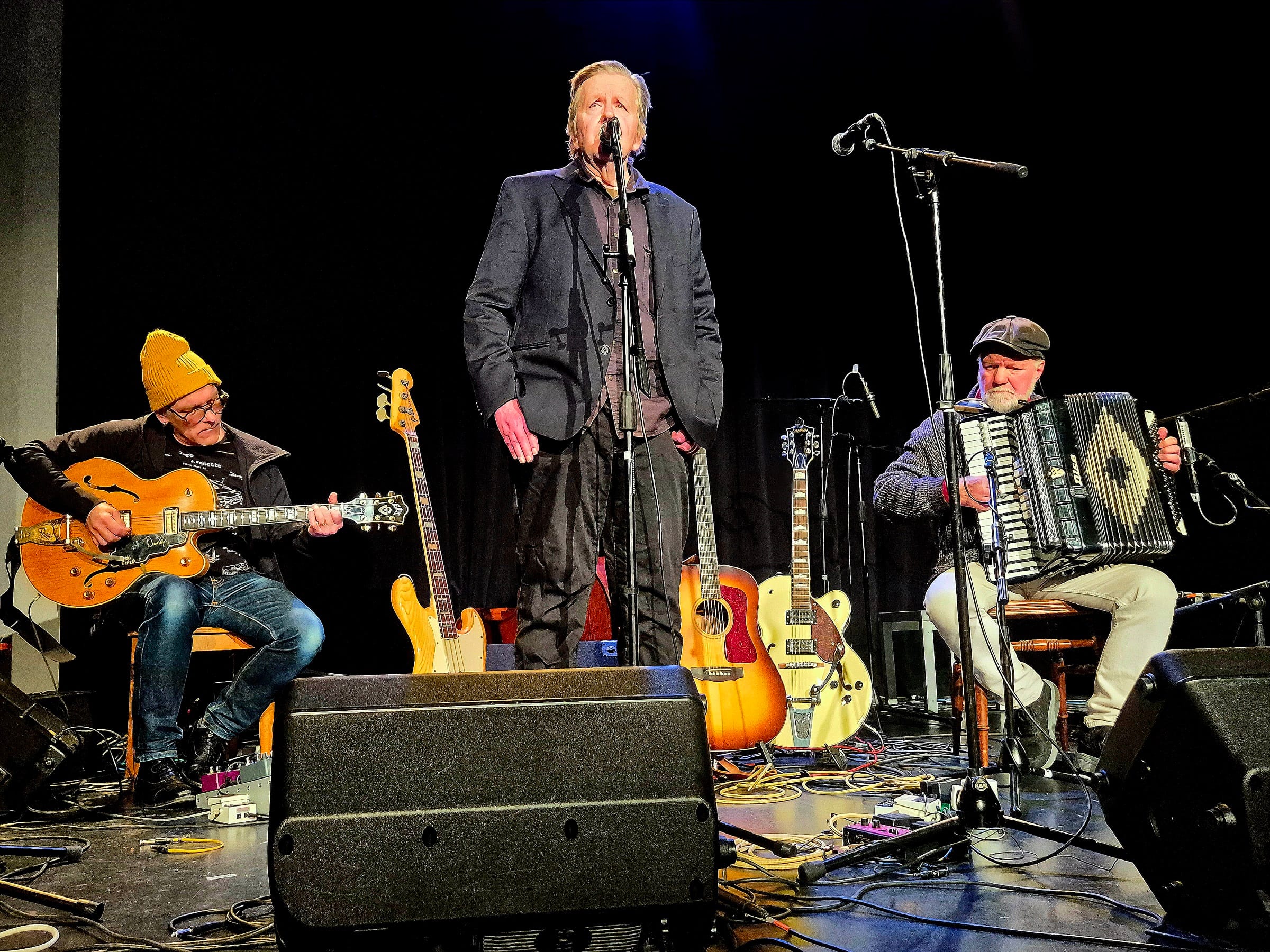 Claes Pihl tar över scenen med sina målande barndomsskildringar från Borås då han var kort men dagarna långa trots att det var sängdags efter sju. Om huset farfar byggt, krusbärskrämen på plattan och gitarren pappa spelade “Romance d’Amour” på. Uppbackad av Henrik Cederbloms (Den Fule, Daniel Lemma, Freddie Wadling) lekfulla nylonslingor och Johan Bengtssons (Cats & Dinosaurs, Swing Tarturo, Midnattsorkestern) smakfulla kontrabasgångar i en tid som ville väl. Täckjackor i klara färger och toppluvor på sniskan. Claes berättar att han aldrig spelat på Aftonstjärnan förut, men att en av hans låtar gjort det på Idiotteaterns nyårsrevyer. I duett med hedersidioten och gårdagens ciceron KG Malm avslutas setet med den fryntliga “Fan vad det söps på den tiden”.