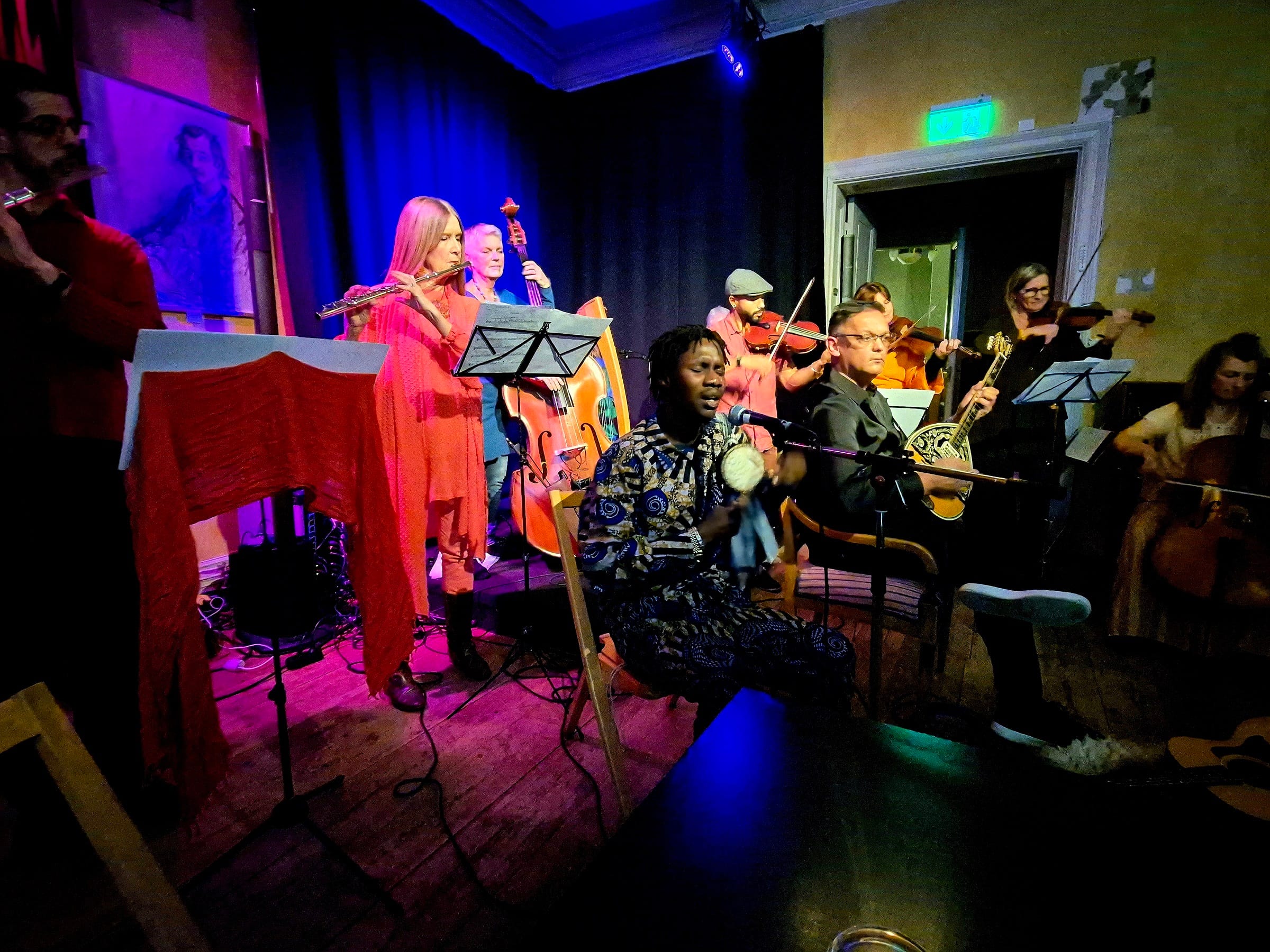 Nere i kaféet avrundar Göteborgs Alternativa Orkester kvällen. Ett kalejdoskopiskt tolvhövdat musikkollektiv i ett gränsöverskridande kollektivt medvetande där språk, kulturer, rytmer och melodier smälter in i varandra. Dubbla tvärflöjter, trippla fioler och dubbla cellor; afrikanska trummor, cajón, harpa, oud, gitarr och kontrabas. Afrikanskt, irländskt, östeuropeiskt, symfoniskt, psykedeliskt, meditativt, sjövilt och organiskt. Jag förstår ingenting – och jag fullkomligt älskar det.