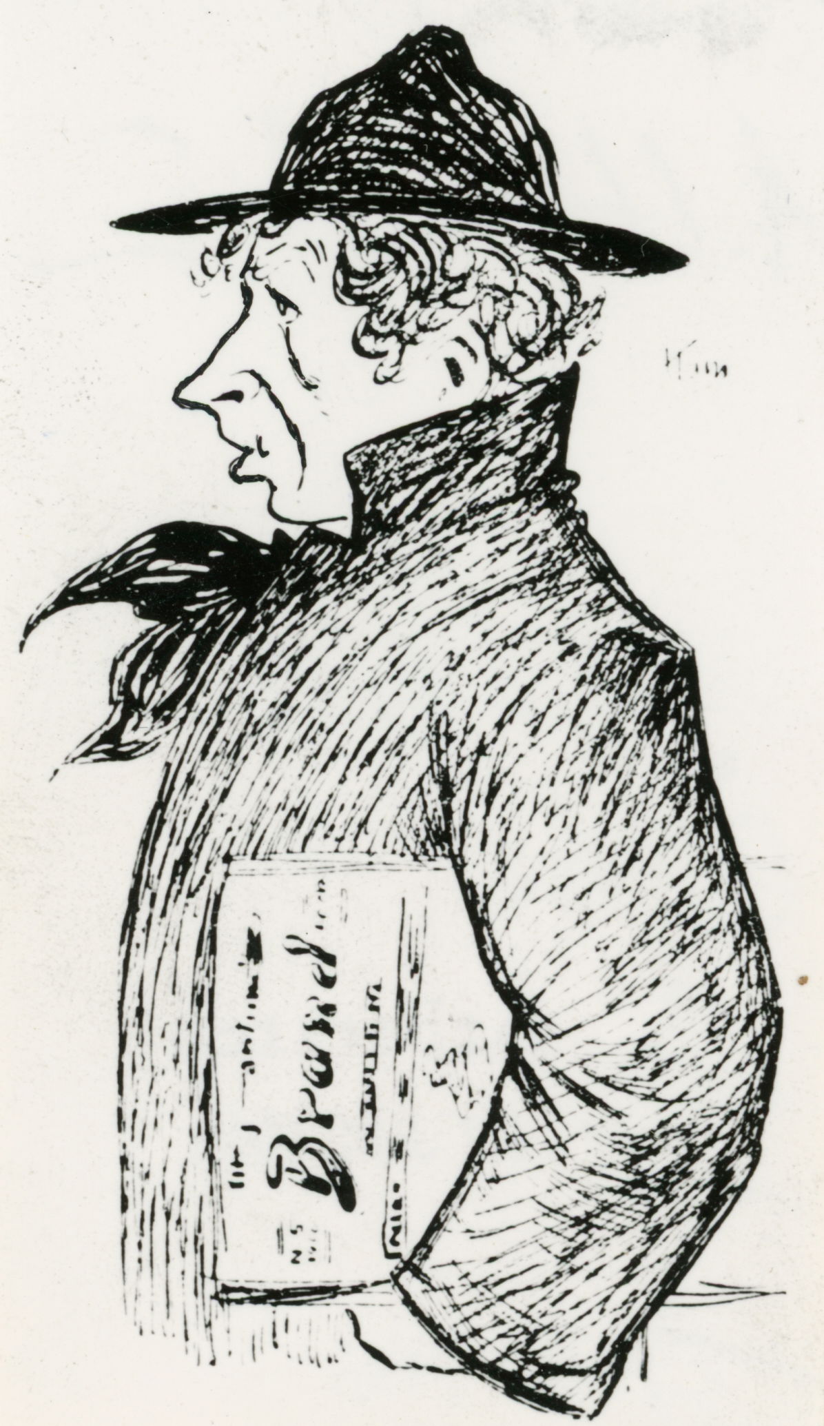 Teckning av förläggaren Axel Holmström med en Brand under armen. Foto: Arbetarens arkiv, okänd tecknare