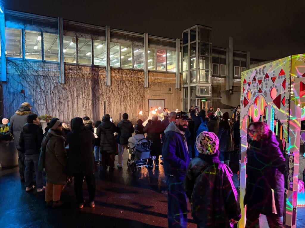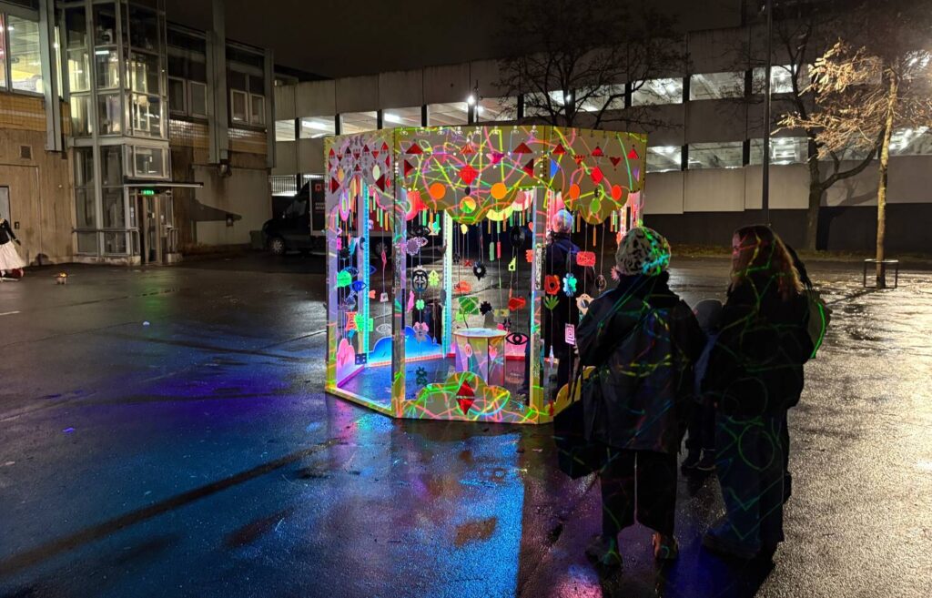 Många hade samlats utanför Tensta konsthall vid paviljongen The light we reflect, en ljusinstallation som konstnären Saadia Hussain skapat utifrån en workshop med deltagare i föreningen Språkbruket.