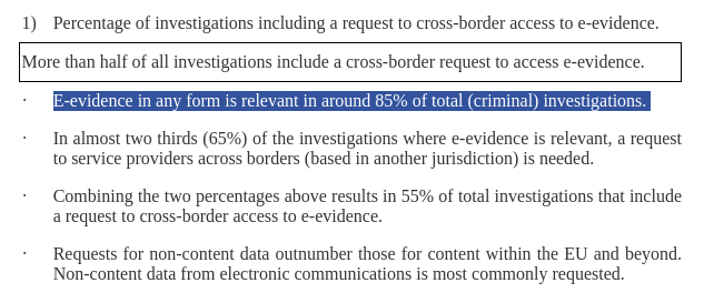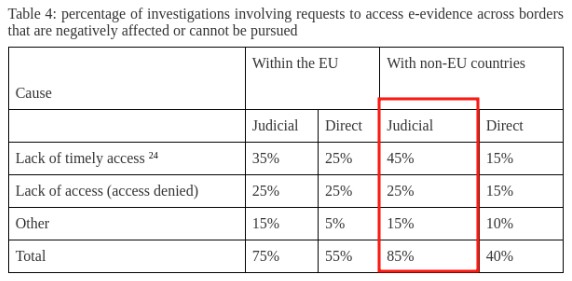 Doing brief research one can find a “Working Document” dated 2018 again regarding digital evidence, the figure is based on requests for access to non-EU states, this makes the statement “[…] 85% of investigations require access to digital evidence” very misleading and not very “honest” from an institution like the European commission. More in detail it specifically concerns judicial (“judicial”) requests where 25% are actually denied requests and 45% a lack of confirmation in a timely manner.