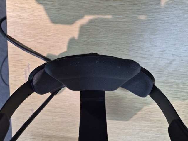 The headset is bulky and has the classic Pimax look, with the colored V on the front plate. Its fit has changed from my previous tests at CES. This time there was a top strap, which helped to make the headset feel more stable and balanced on my head, but both the eye-relief mechanism and the knob to regulate the weight on the forehead disappeared. The result is that the headset is easier to wear, but its fit is less customizable, so some people may not be happy about that.