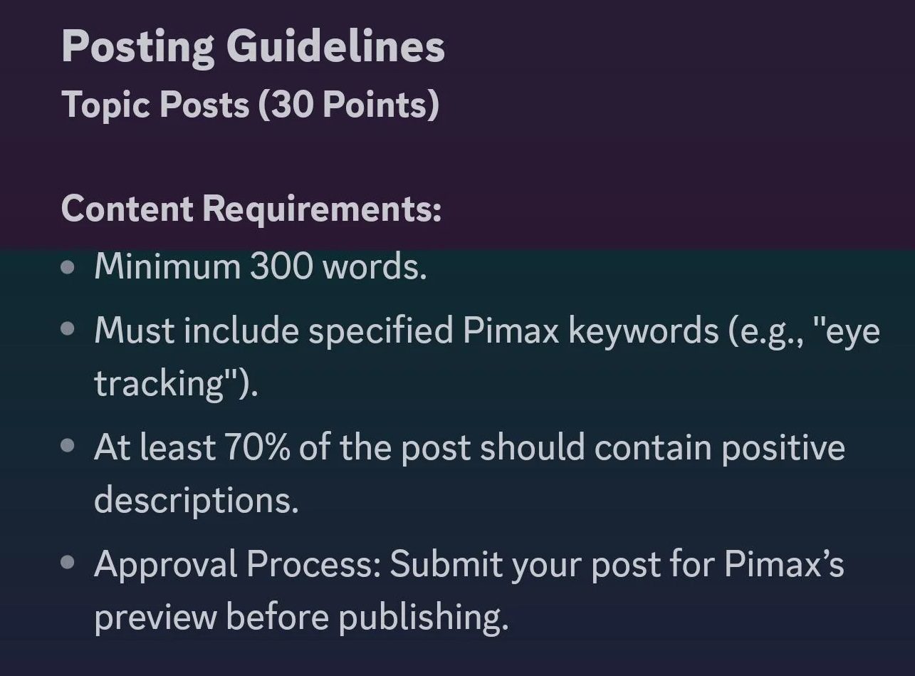 The only thing selected participants needed to do was type up a verifiably positive post for Reddit “or any other forums you visit,” submit it to Pimax for approval, post it online, and rack up the points. Below is an excerpt from the posting guidelines given to Mavgaming1 via Discord.