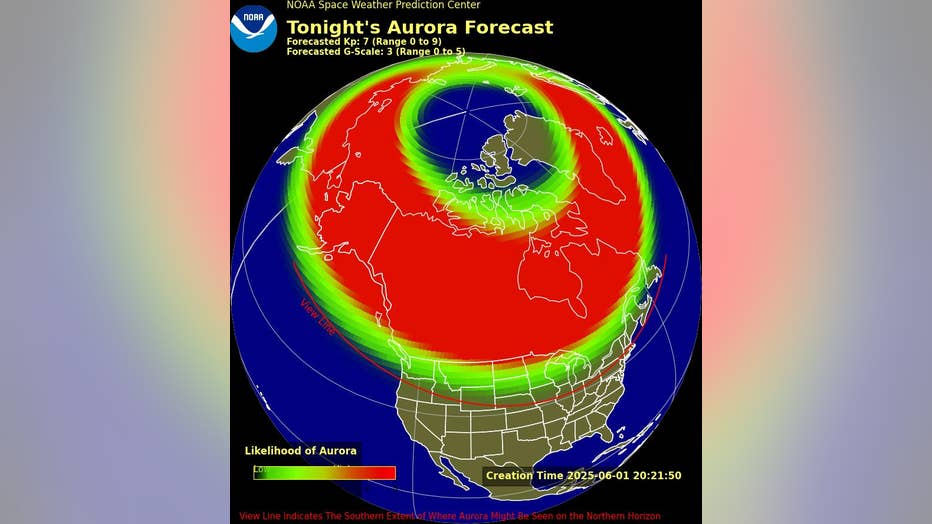The NOAA forecast shows the aurora could be visible as far south as central Iowa.