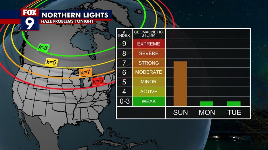 (FOX 9) – The Northern Lights are expected to be visible Sunday night, but haze from wildfire smoke might spoil the show for Minnesota.