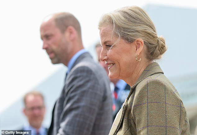 Meanwhile, Sophie was beaming as she waved at crowds, with the Duchess also wearing a greige checked blazer that she paired with a tan, calf-length skirt and a light pink shirt.