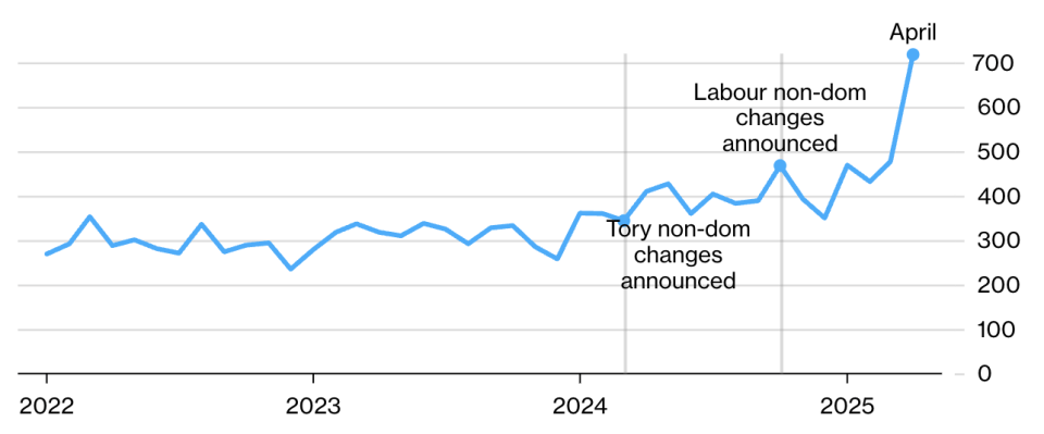Exits in April are recorded to be 75% higher than the year before and the highest level in four years. The highest levels are seen in finance, insurance, and real estate. Popular with non-doms…