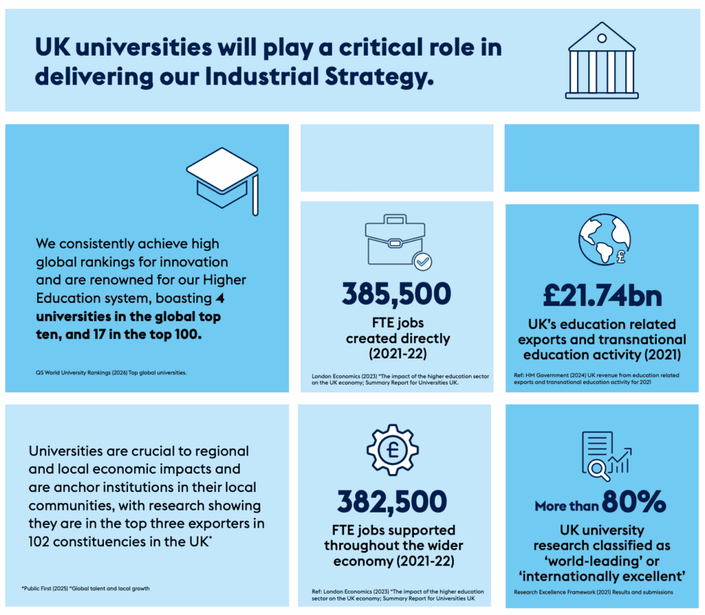 In May 2025, Universities UK released a report lobbying the government to recognise the significant role universities should play in UK business infrastructure.
