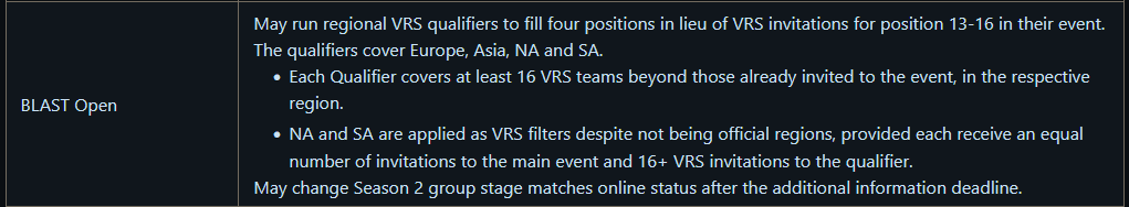 Until this update, the only VRS exception granted to the event allowed four regional qualifiers for the event, as opposed to inviting the 13th-16th ranked teams directly through VRS.