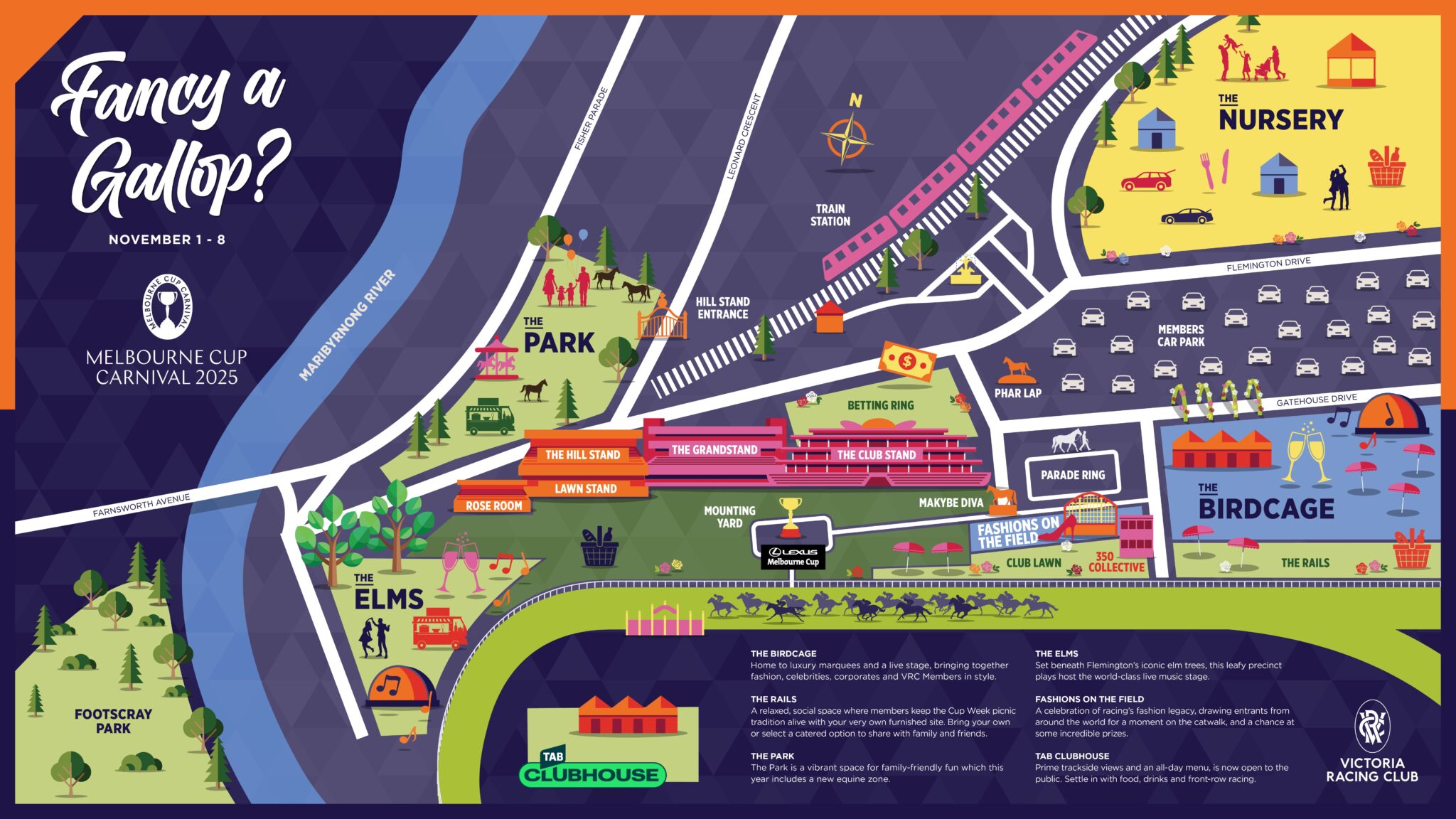 The Nursery will be open on Victoria Derby Day, Crown Oaks Day and TAB Champions Stakes Day. It will be converted into extra car parking on Lexus Melbourne Cup Day for VRC Members who hold an Unreserved Car Park Pass.