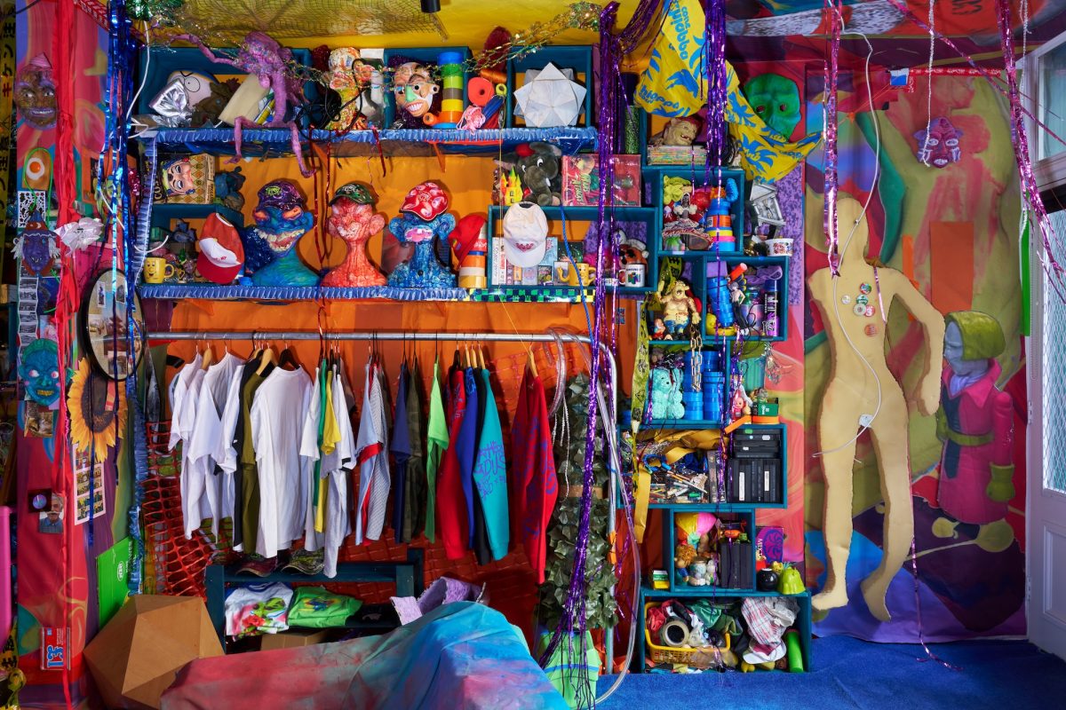 The show is divided into two levels. Downstairs feels like a physical version of Card’s brain—part artist’s studio, part 1990s curiosity shop. As you enter, you’ll find an old TV playing blurry videos, books scattered across the floor, and shelves packed with vintage toys, strange sculptures, and print ephemera. Some objects feel random, others carefully placed, but none of it is polished or easy to define. As Card himself puts it, the space pays tribute to those passionate shopkeepers of the past, who filled their stores to the brim with things they loved. It’s a celebration of scraps, and of world-building through leftovers.
