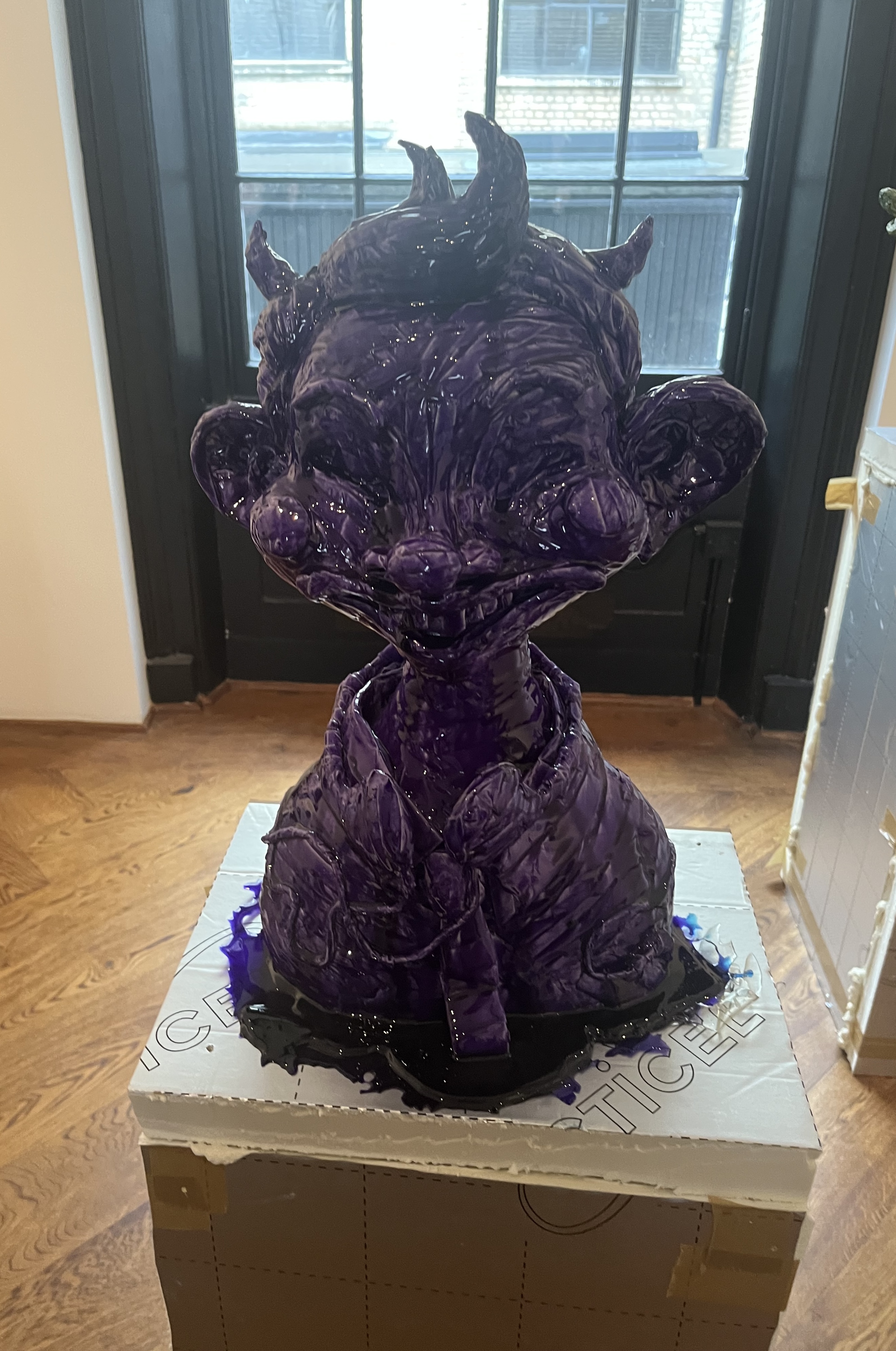 Upstairs, twelve busts continue the fiction. At first glance, they look like heavy ceramic sculptures—but pick one up, and you’ll realize they’re surprisingly light. Made using Card’s signature masking tape method, they are rough, exaggerated, and full of personality. Their oversized teeth, distorted features, and wild expressions challenge our idea of what sculpture should be. Though still, they seem to speak—to mock, to grin, maybe even to warn.