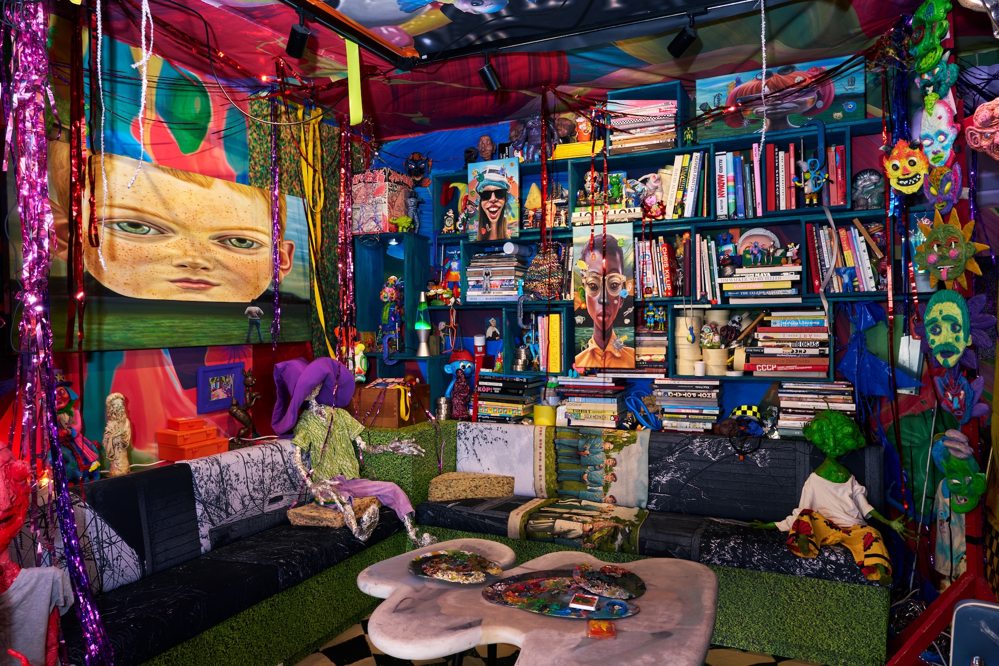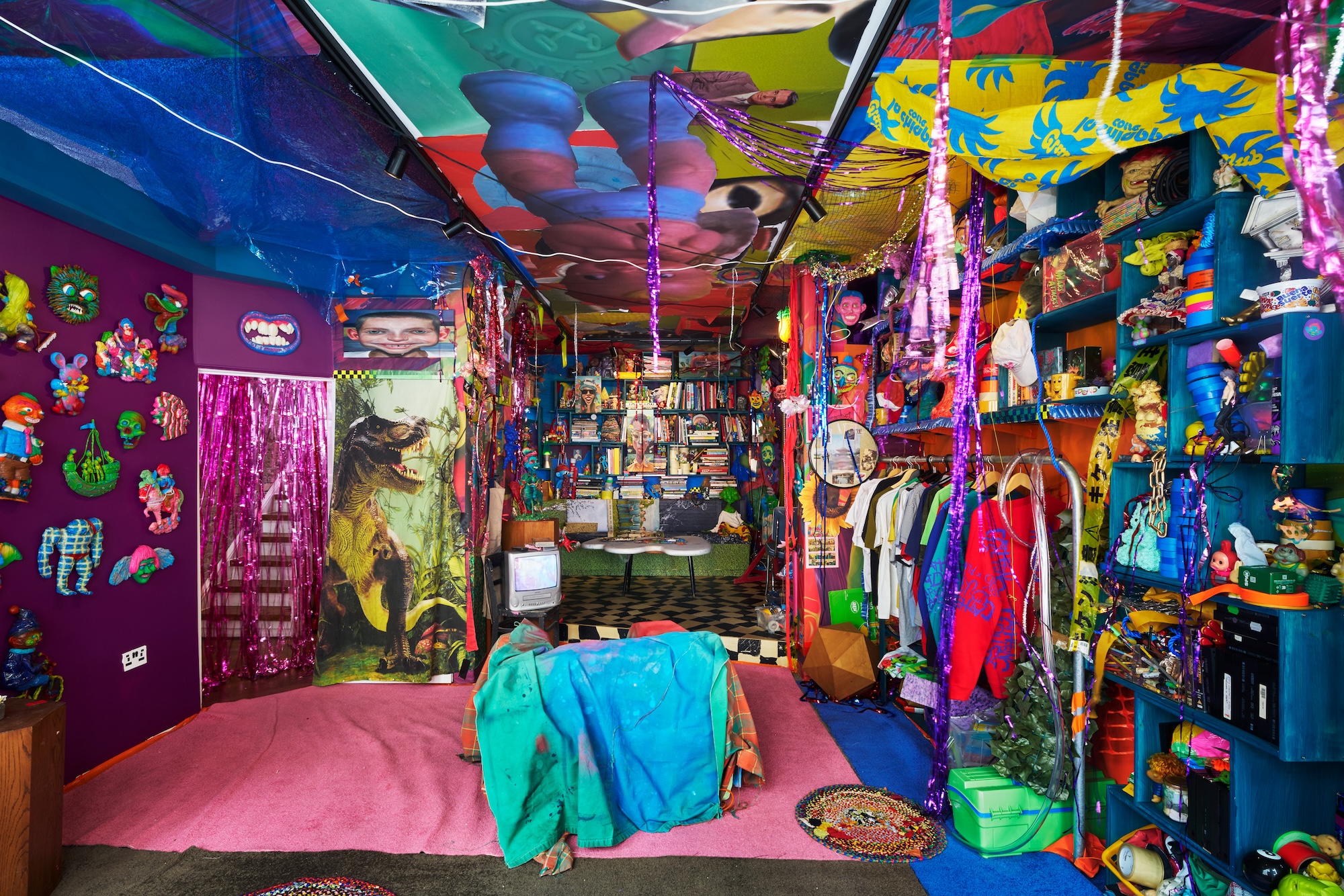 The show is divided into two levels. Downstairs feels like a physical version of Card’s brain—part artist’s studio, part 1990s curiosity shop. As you enter, you’ll find an old TV playing blurry videos, books scattered across the floor, and shelves packed with vintage toys, strange sculptures, and print ephemera. Some objects feel random, others carefully placed, but none of it is polished or easy to define. As Card himself puts it, the space pays tribute to those passionate shopkeepers of the past, who filled their stores to the brim with things they loved. It’s a celebration of scraps, and of world-building through leftovers.
