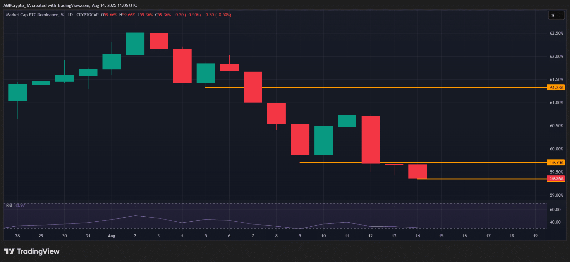Over the past two months, BTC.D slid from 65% to 59%, even as Bitcoin rallied 15% to a $123K ATH, indicating that BTC’s gains are not fully capturing market inflows.